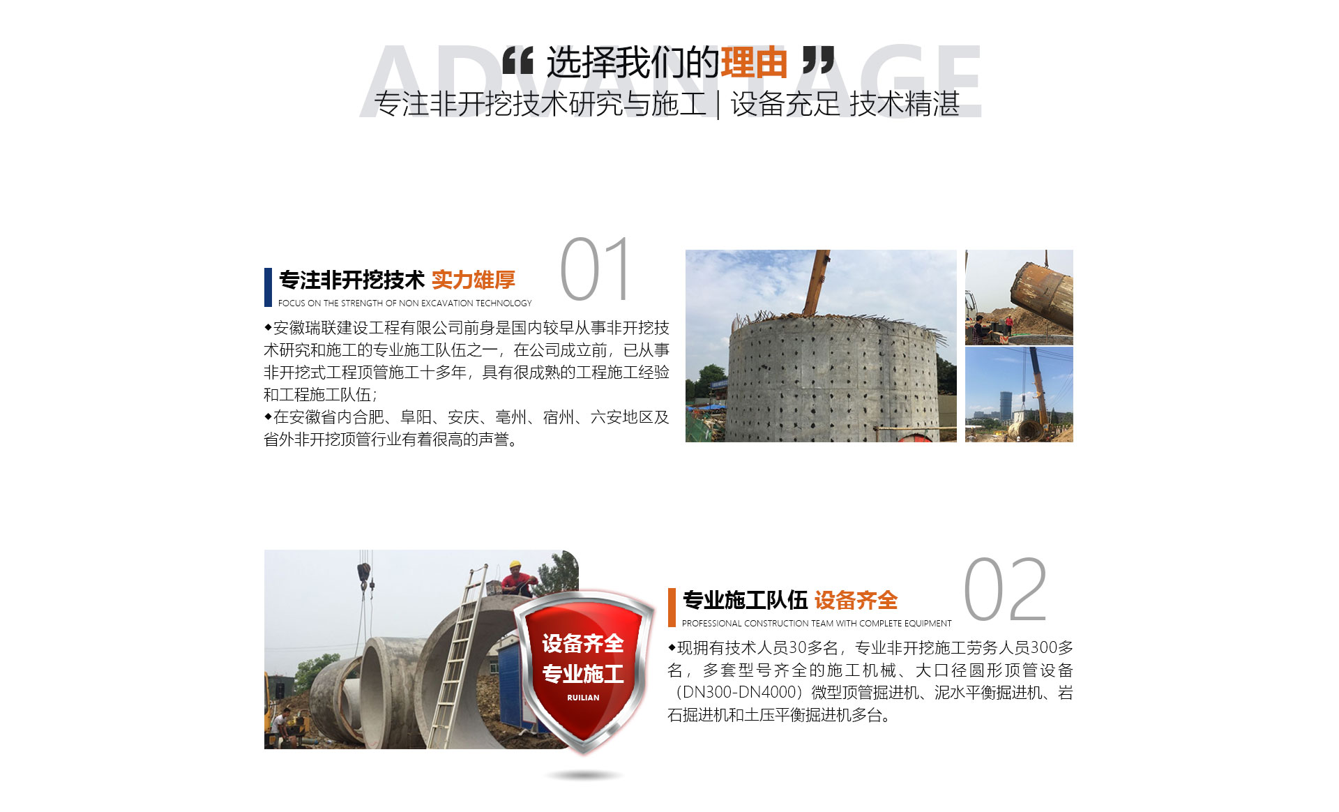 安徽瑞聯(lián)建設(shè)工程有限公司前身是國(guó)內(nèi)較早從事非開(kāi)挖技術(shù)研究和施工的施工隊(duì)伍之一,在公司成立前,已從事非開(kāi)挖式工程頂管施工十多年,具有很成熟的工程施工經(jīng)驗(yàn)和工程施工隊(duì)伍,在安徽省內(nèi)合肥、阜陽(yáng)、安慶、亳州、宿州、六安地區(qū)及省外非開(kāi)挖頂管行業(yè)有著很高的聲譽(yù)。面對(duì)日益擴(kuò)大的市場(chǎng),公司于2014年正式成立,公司擁有勞務(wù)分包及市政公用工程總承包資質(zhì)。公司優(yōu)勢(shì)(文字):現(xiàn)擁有中高技術(shù)人員30多名,非開(kāi)挖施工勞務(wù)人員300...
